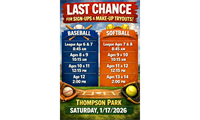 Sign-ups ending soon! Sign up before space in your division fills up! registration will go on during tryouts this Saturday 1/10 from 9am - 3 pm and Sunday from 1-3 pm at Thompson Park.